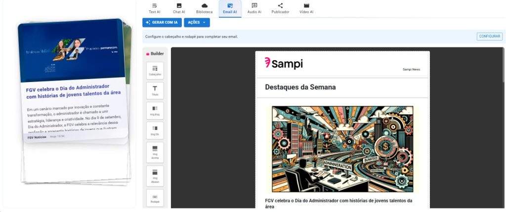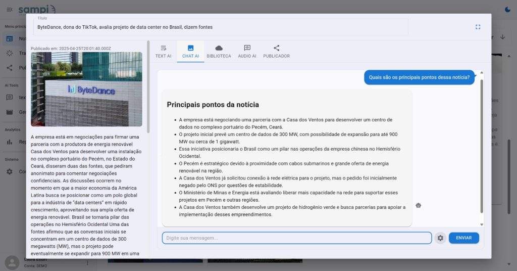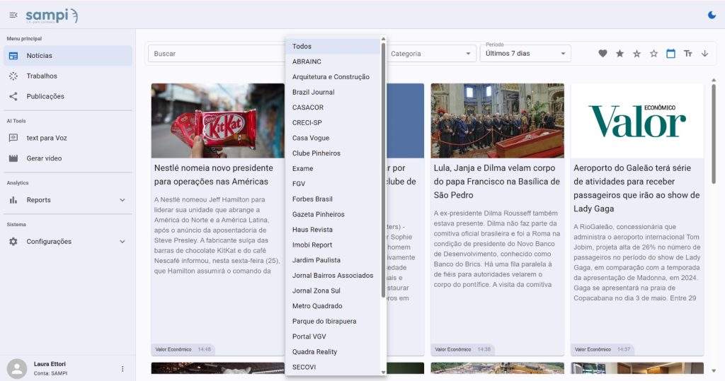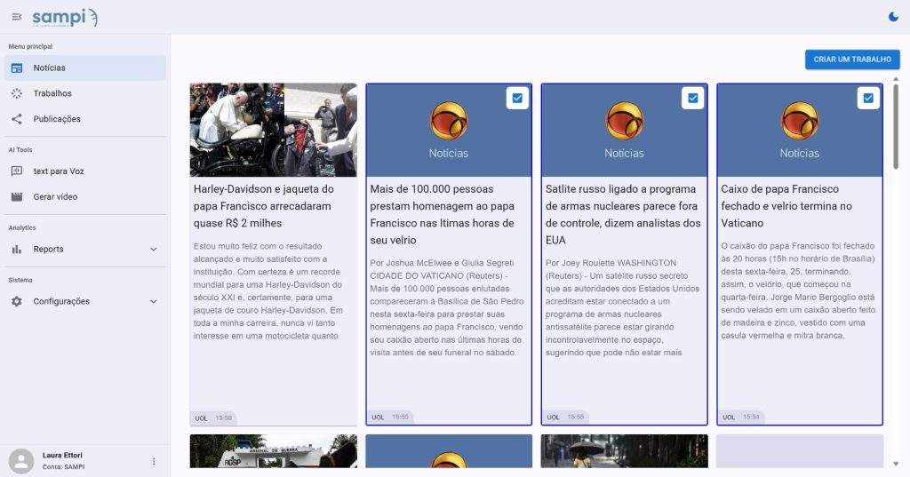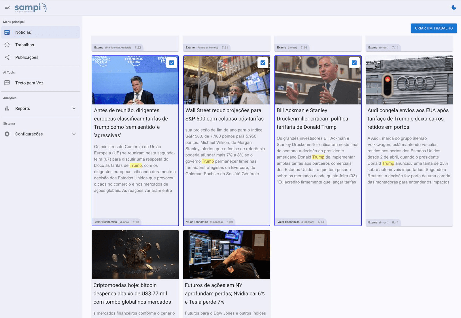 A IA da Sampi varre sites e APIs de notícias nacionais e internacionais. As informações são organizadas e classificadas por tema, relevância e tempo. Você escolhe os filtros e vê tudo em uma única interface, pronta para usar. Em poucos cliques, você já pode transformar essa notícia em conteúdo seu.