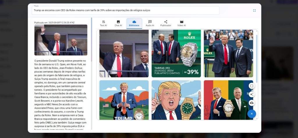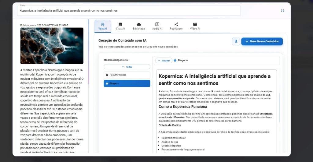 Combine múltiplas fontes texto, imagem, vídeo e gráficos para criar conteúdos únicos, comparativos ou analíticos, ideais para portais, newsletters e relatórios especializados.