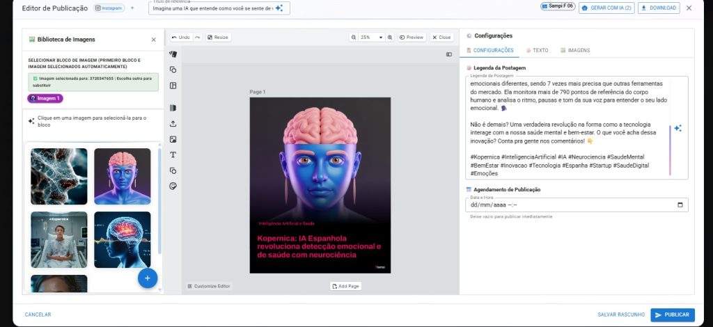 Você escolhe o conteúdo base (um texto, uma notícia, uma transcrição) e define para quais redes vai publicar. A Sampi gera os posts, já com formatação ideal, legenda e até imagem. Prontos para agendamento ou publicação direta.